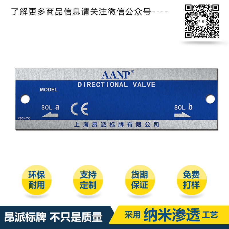電磁方向閥標牌 時間:2022-03-04 14:42:01 分類:泵閥標牌 瀏覽:次 1.產品工藝:公司引進德國鋁板平網絲印機(“納米滲透印刷”分子與分子結合油墨滲透進鋁板內層,與鋁融為一體,經過處理長期使用不易褪色)該機器特點可在金屬鋁表面印刷多色圖文,所印圖文細膩生動,還原客戶對色彩的要求。2.產品尺寸標準,專業的技術人員,保證產品尺寸的標準化。 分享收藏: 上一個: 方向閥標牌 下一個: 電磁閥標牌 相關案例 電磁閥溢流閥標牌 閥門標牌 方向控制閥標牌 電磁閥標牌 方向閥標牌 電磁閥門標牌