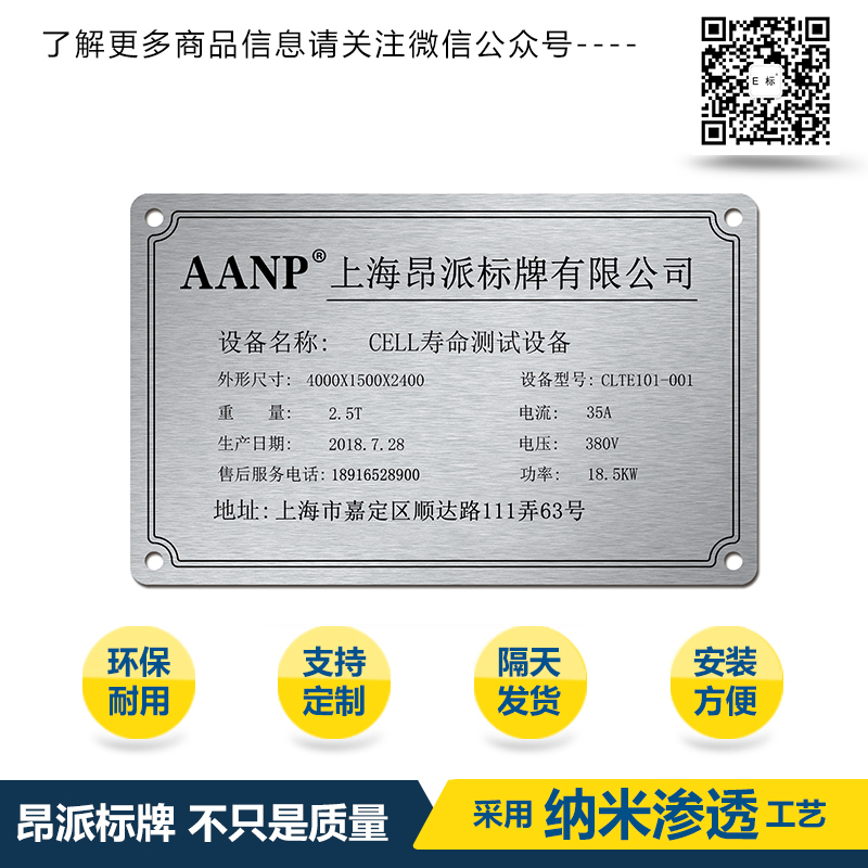 設備銘牌 時間:2018-09-10 13:47:18 分類:金屬銘牌 瀏覽:次 標牌、銘牌、鋁牌的品質: 本產品具有耐酸堿、耐熱震、耐高溫、抗沖擊、還具有很強的耐曬、耐磨擦、耐高溫、耐腐蝕、耐有機溶劑等特性,抗紫外線、抗粉化、不受臭氧、空氣污染、在室外陽光照射不易褪色,廣泛應用于化工、電力和電信等腐蝕性強或須把標志牌懸掛于室外的企業,歡迎新老客戶拿圖拿樣來定做.不分量大小都可以定做價格合理.質量保證交貨準時。 分享收藏: 上一個: 英文標牌 下一個: 箭頭標牌 相關產品 陽極氧化指示小標牌 自動化設備鋁標牌 汽車零配件鋁標牌 陽極氧化指示標牌 電磁閥萬用鋁合金防偽標牌 電磁閥溢流閥標牌