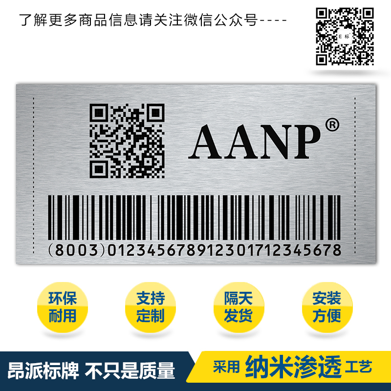 科技公司條碼牌 時間:2018-05-21 16:51:05 分類:金屬條碼 瀏覽:次 金屬二維碼采取高科技印刷工藝以及質量優勢: 金屬二維碼---進口鋁板---高科技德國印刷技術---耐摩擦,耐溶劑,耐高溫,抗摩擦,耐紫外線,耐化學品性,耐腐蝕性,滲透印刷技術做出來的金屬二維碼使用壽命久不易掉色,金屬二維碼識別率快,掃描識別率高,并能保持光潔。 分享收藏: 上一個: 車輛條碼牌 下一個: 石油二維碼 相關產品