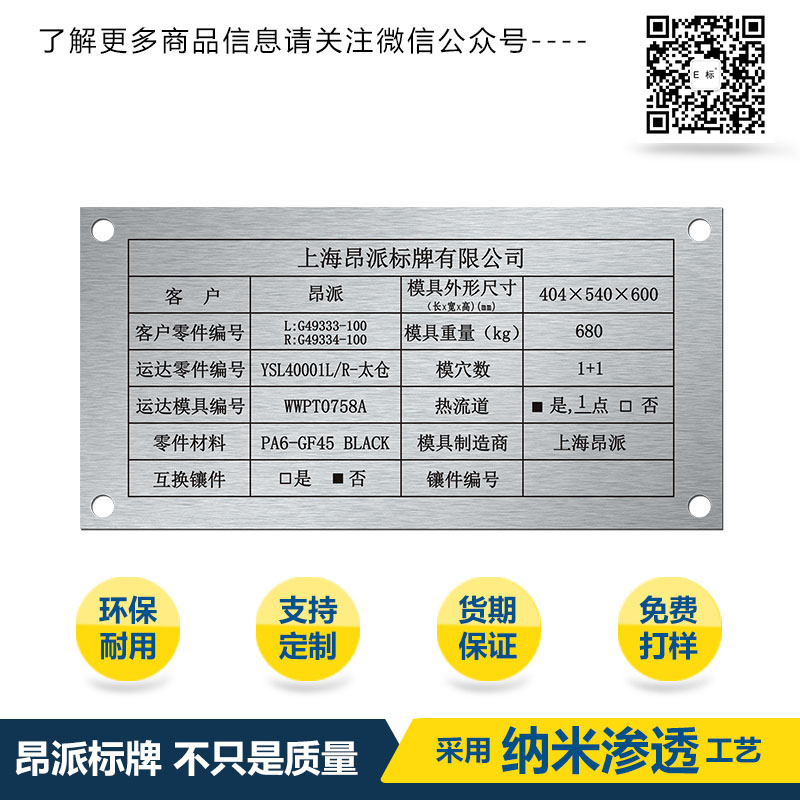 領先的供應商之一。上海昂派標牌生產(chǎn)的銘牌工藝是采用特種印刷,處理工序復雜,難于防造,能承