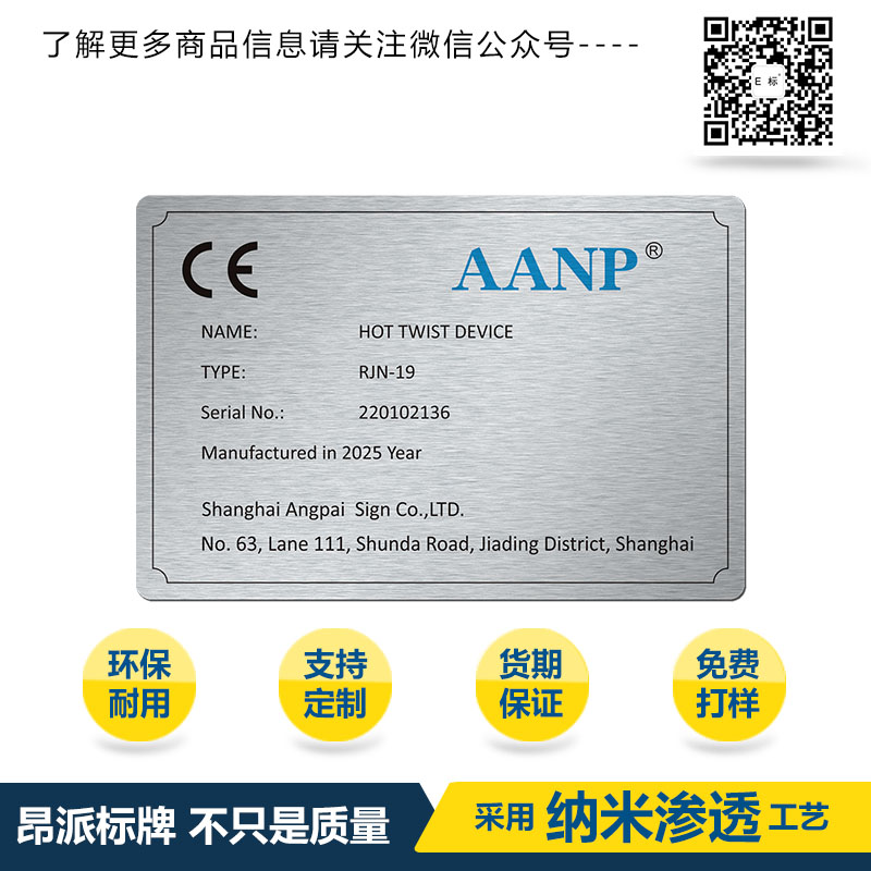 自動化設備鋁標牌 時間:2025-05-07 10:29:37 分類:陽極氧化銘牌 瀏覽:次 我司長期備有進口的生產原材料,和一批高素質的專業生產隊伍,細致精密的操作流程及現代化的管理體系,對你的需求我們有絕對的信心做好。昂派標牌”將不斷努力創造出更高品質的銘牌,為用戶提供更佳服務,努力做到你最滿意的合作伙伴。 分享收藏: 上一個: 設備信息陽極氧化鋁牌 下一個: 陽極氧化指示小標牌 相關案例